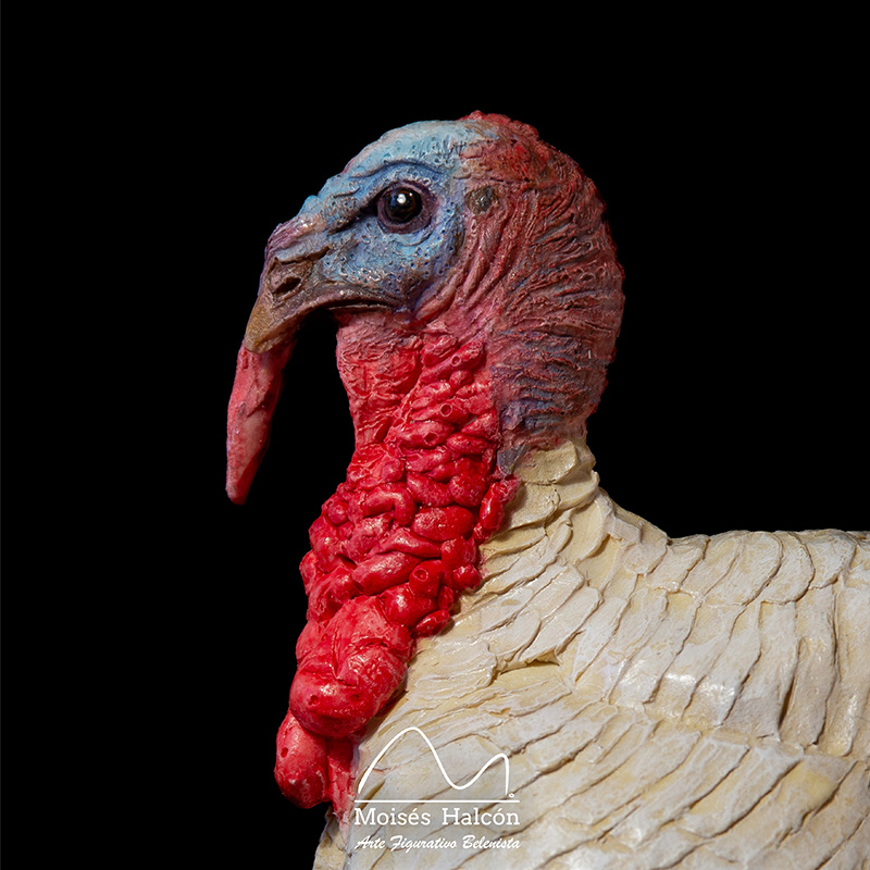 Pavo para Belén, figura de gran realismo y cuidada definición en el plumaje y la cabeza, con una policromía detallada que realza su expresividad. No incluye peana, lo que permite colocarlo libremente en el belén, apoyado sobre sus propias patas e integrado de forma natural en la escena.